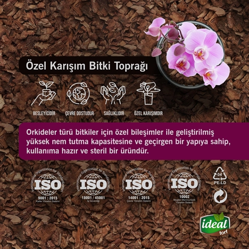 Özel karışım bileşenleri içerisinde bulunan işlenmiş çam kabuğu ile, orkide için gerekli uygun asidikortam sağlanır. Dengeli yapısı ve uygun Ph oranı ile orkide kökleri gereksinim duyduğu hava ve ışığı rahat alır.
